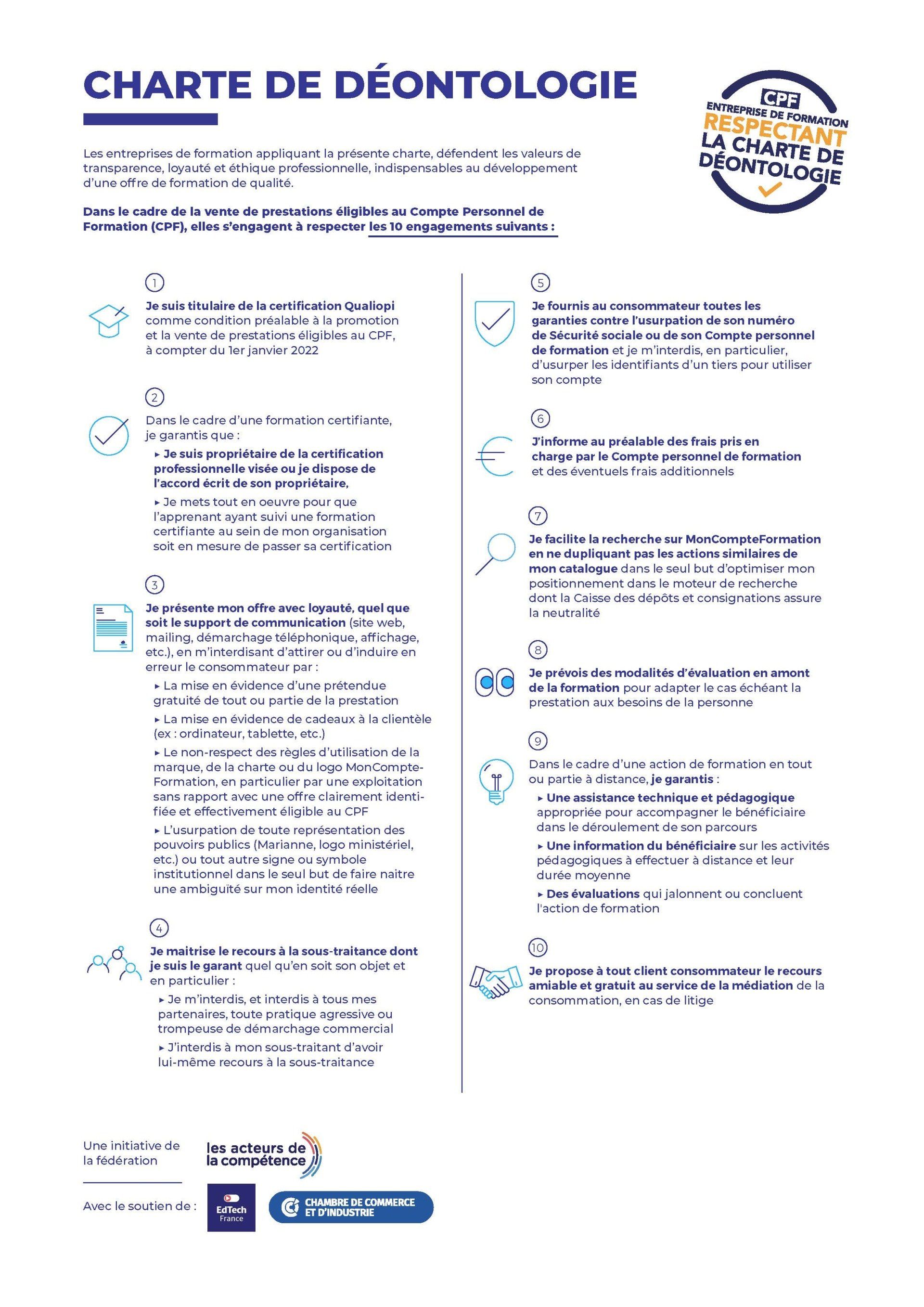 INITIATIVES vente directe est fier de s'inscrire dans la charte de déontologie des entreprises délivrant des formations éligibles au Compte Personnel de Formation (CPF) initié par les acteurs de la compétence (Fédération de la formation professionnelle)